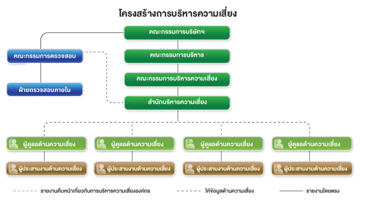 การจัดประเภทของความเสี่ยงช่วยให้กลุ่มบริษัทฯ สามารถมองเห็นความเสี่ยงแบบองค์รวม พร้อมประเมินผลกระทบที่ความเสี่ยงอาจมีต่อส่วนงานภายในและภายนอก และฝ่ายต่างๆที่เกี่ยวข้อง โดยสำนักบริหารความเสี่ยง (Risk Management Office) ทำหน้าที่ประสานกับ Risk Champion และ Risk Officer ในการให้แนวทางกระบวนการบริหารความเสี่ยง การติดตามและรายงานผลการบริหารความเสี่ยงผ่านตัวชี้วัดความเสี่ยง (Key Risk Indicator)
