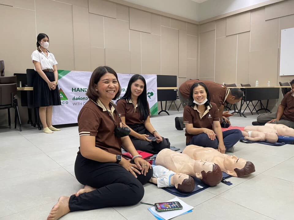 Surat Thani plant, organized a training program in 2023 aimed at equipping its employees with essential skills. This training involved knowledge transfer and hands-on practice in CPR (Cardiopulmonary Resuscitation) techniques, enabling them to effectively revive individuals who have ceased breathing or experienced cardiac arrest. Notably, this training has been successfully completed by 70% of the company’s workforce. ​​​​