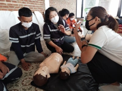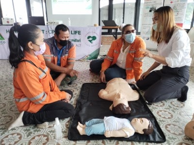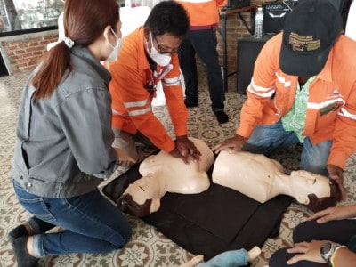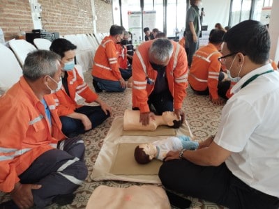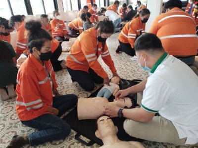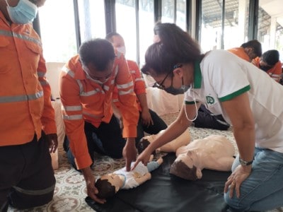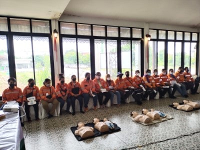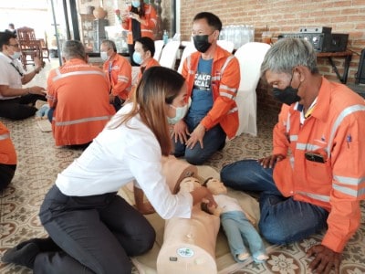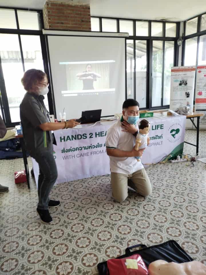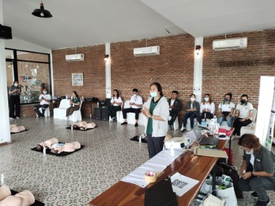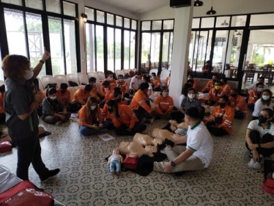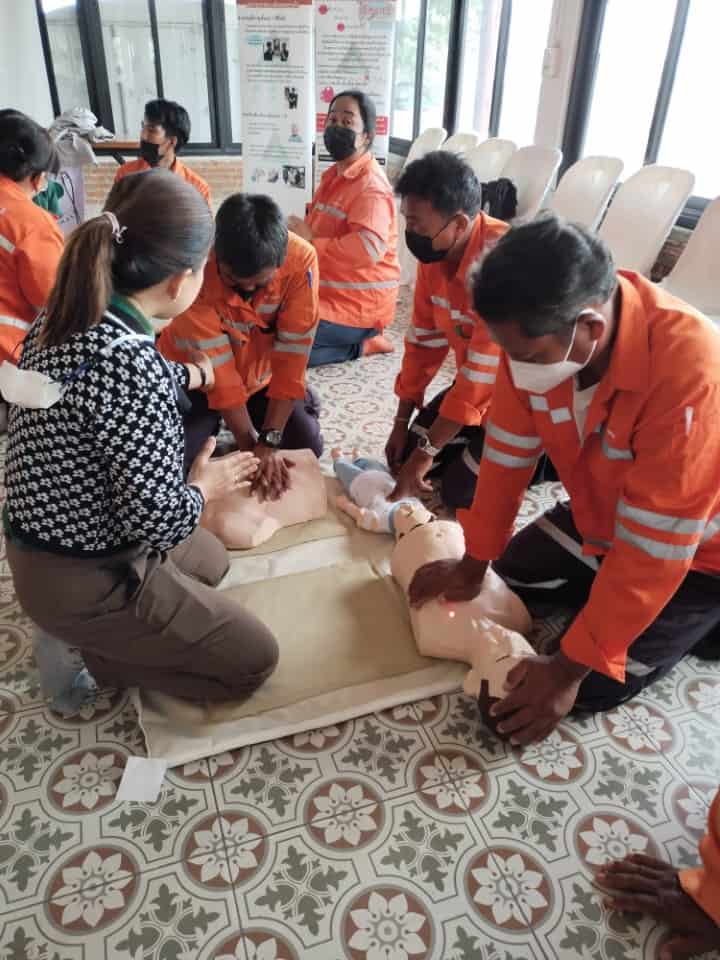 On June 10, 2023, the Hands 2 Heart: CPR for Life project organized basic life support training for the employees at Chaiyaphum Construction Site. The training took place at Than Thong Resort, Chaiyaphum province, and included 52 participants. They were divided into two sessions: 35 in the morning session and 17 in the afternoon session, consisting mainly of drivers and field engineer employees. Additionally, employees from the Chaiyaphum Provincial Office attended. Among the participants, there were 13 certified basic life support instructors for the general public, hailing from the Rayong, Phitsanulok, Nakhon Ratchasima, and Phra Pradaeng plant. These instructors had received training in May and were now sharing their knowledge. The training covered a range of topics, including lectures on basic life support and the latest guidelines. Participants practiced basic life support techniques for adults, children, and infants, learned to use an AED machine, practiced clearing airway obstructions in adults and infants, and engaged in real-life scenario simulations for hands-on experience.
