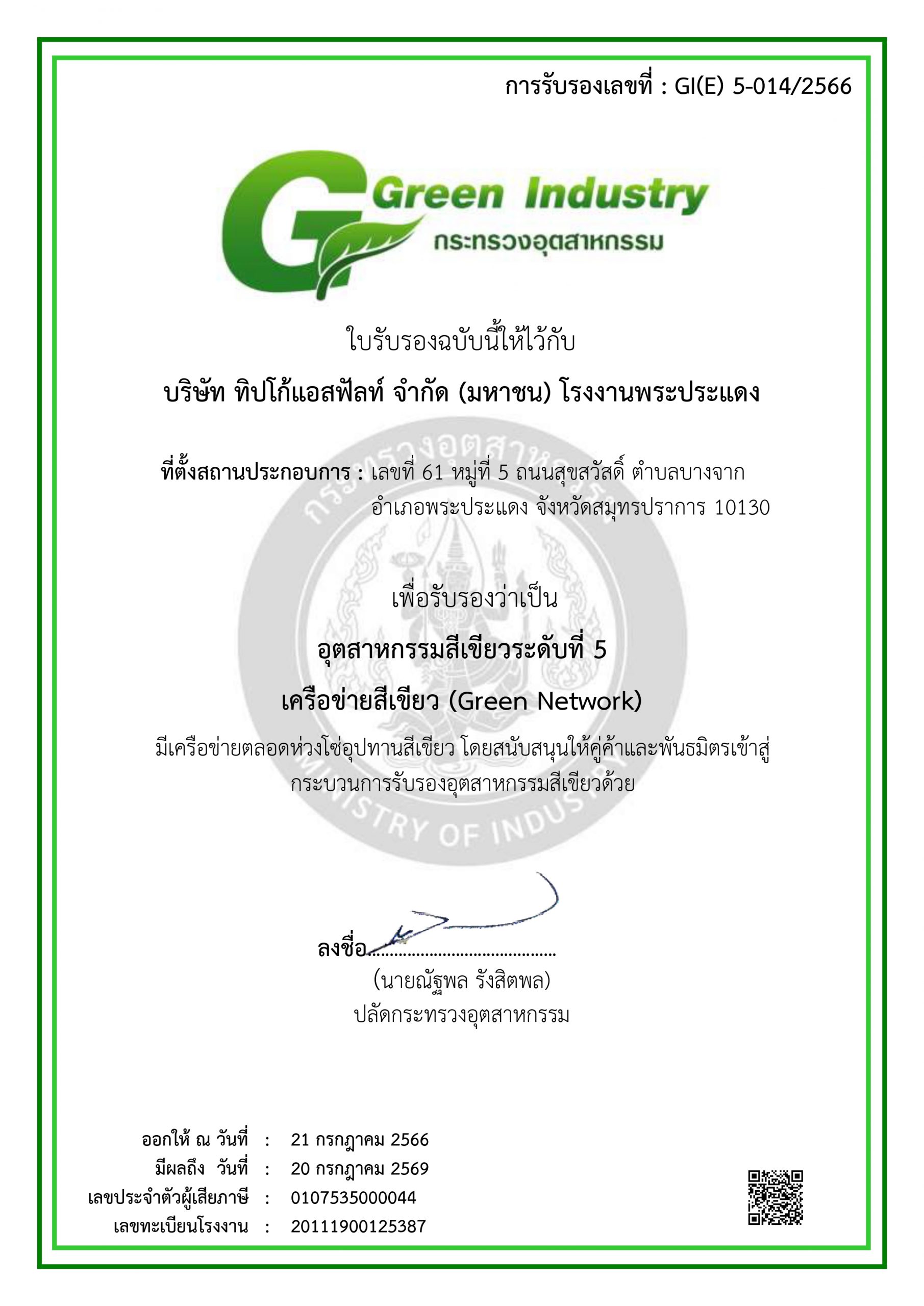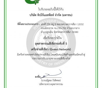 ใบรับรองอุตสาหกรรมสีเขียวระดับที่ 5 บริษัท ทิปโก้แอสฟัลท์ จำกัด (มหาชน) โรงงานพระประแดง – เครือข่ายสีเขียว กระทรวงอุตสาหกรรม