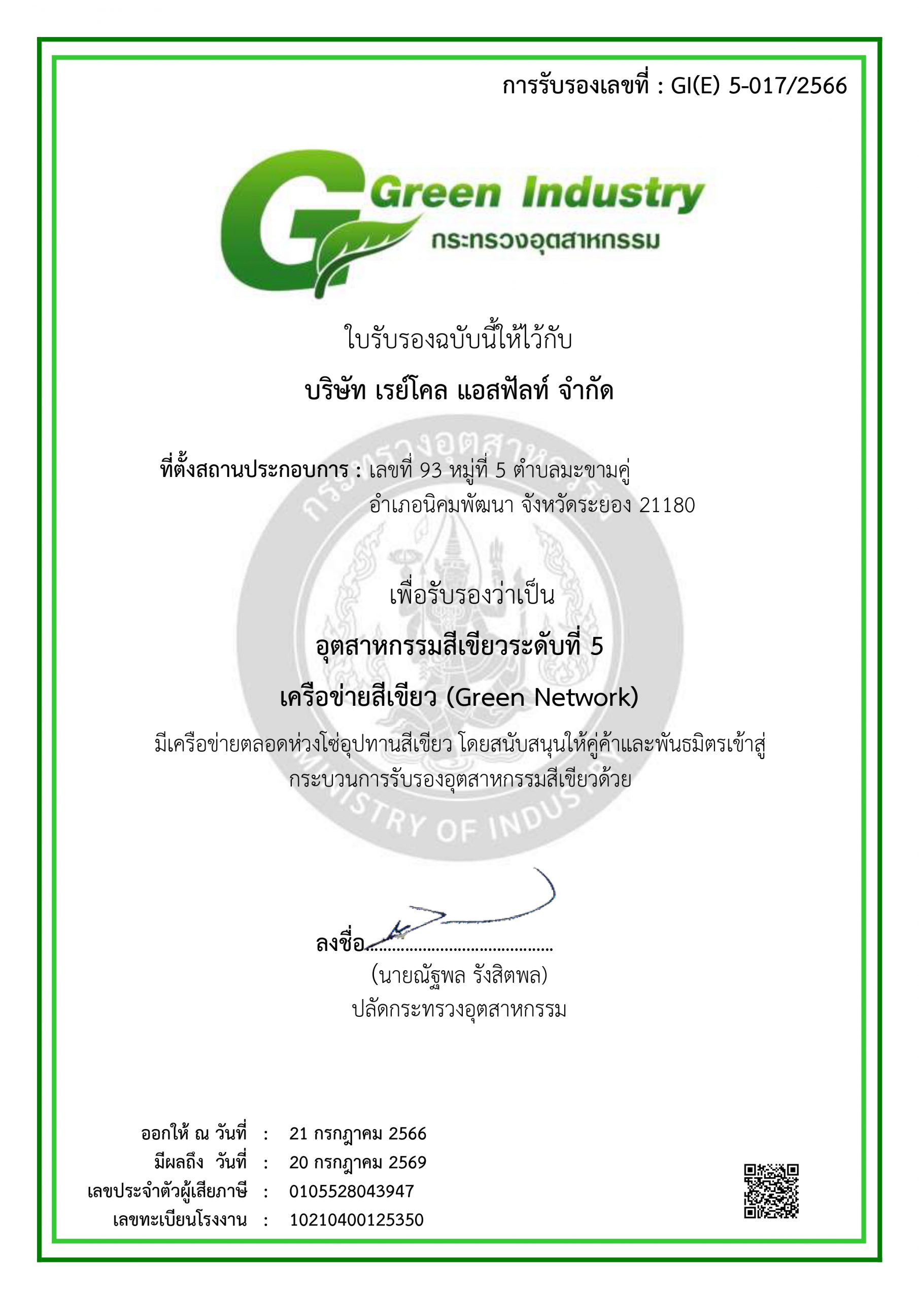 ใบรับรองอุตสาหกรรมสีเขียวระดับที่ 5 บริษัท เรย์โคล แอสฟัลท์ จำกัด – เครือข่ายสีเขียว กระทรวงอุตสาหกรรม