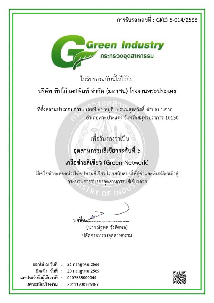 ในวันที่ 28 เมษายน 2566 ทางองค์กรบริหารจัดการก๊าซเรือนกระจก (องค์กรมหาชน) ให้การรับรองโครงการสนับสนุนกิจกรรมลดก๊าซเรือนกระจกให้กับโรงงานพระประแดง และโรงงานนครราชสีมา ในกลุ่มบริษัททิปโก้แอสฟัลท์ จำนวนทั้งหมด 4 โครงการ จากการดำเนินกิจกรรมที่สามารถ ลดการปลดปล่อยก๊าซเรือนกระจกได้ 216.056 ตันคาร์บอนไดออกไซด์เทียบเท่า