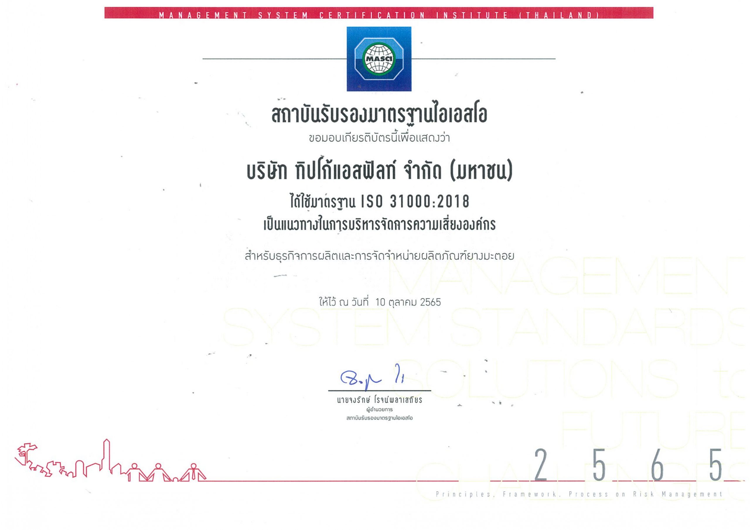 เกียรติบัตรจากสถาบันรับรองมาตรฐานไอเอสโอ 31000 : 2018