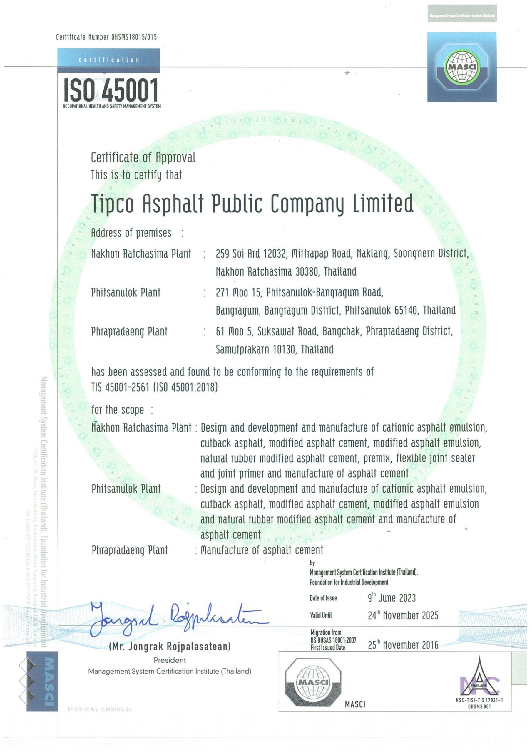 ISO 45001:2018 has been assessed and found to be conforming to the requirements of TIS 45001-2561