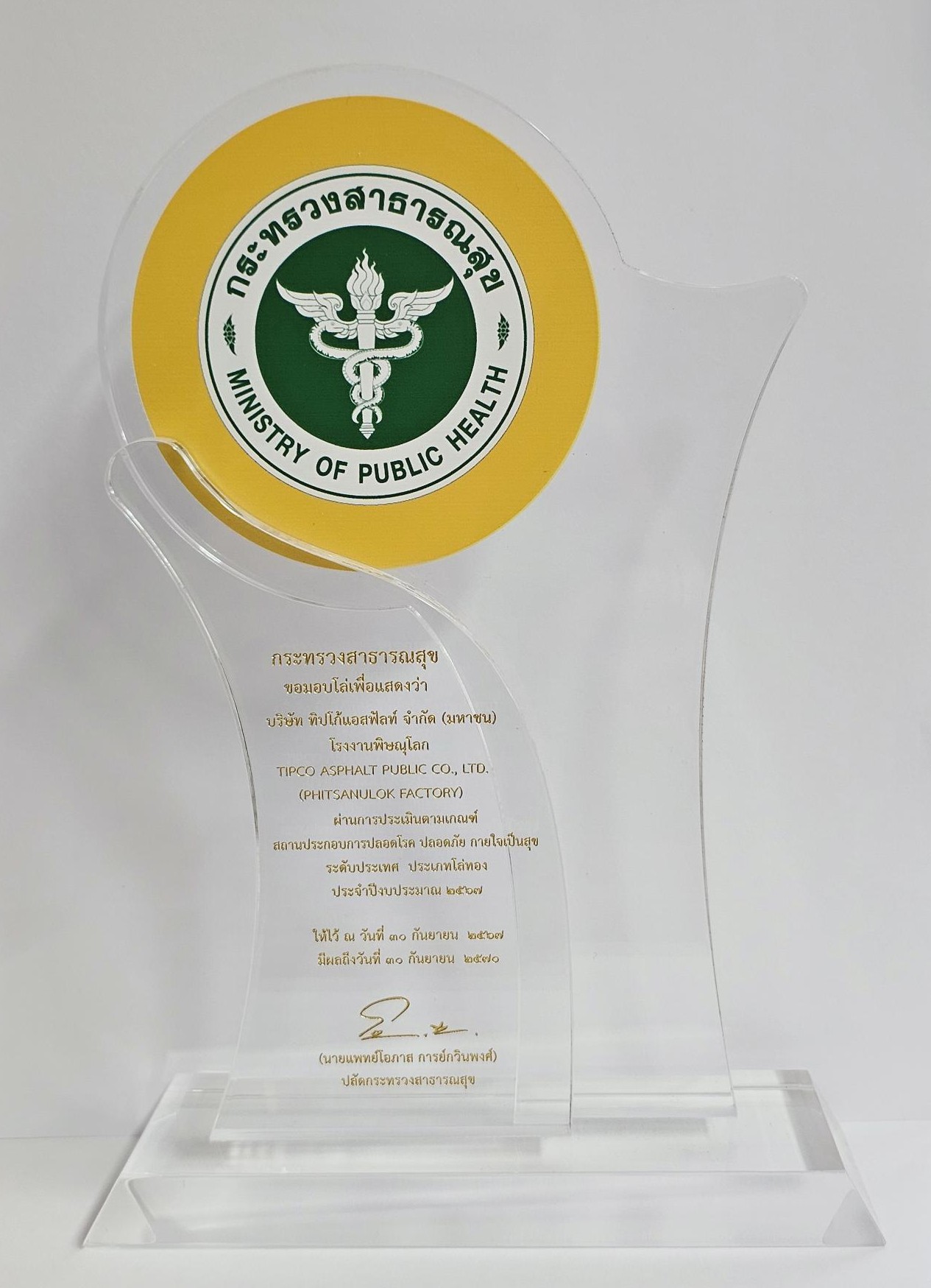 On December 20, 2024, Tipco Asphalt Public Company Limited, Phitsanulok Plant, was honored with the national “Disease-Free, Safe Workplace, Healthy Body and Mind Award 2024” (Gold Level) from Ministry of Public Health. The award was presented by Dr. Direk Khumpan, Deputy Director-General of the Department of Disease Control, Ministry of Public Health.