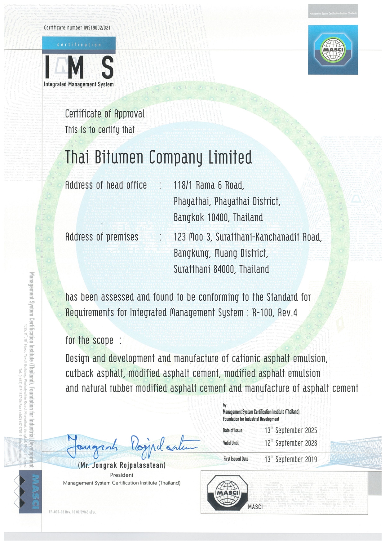 Thai Bitumen Company Limited has been assessed and found to be conforming to the Standard for Requirements for Integrated Management System : R-100, Rev.4