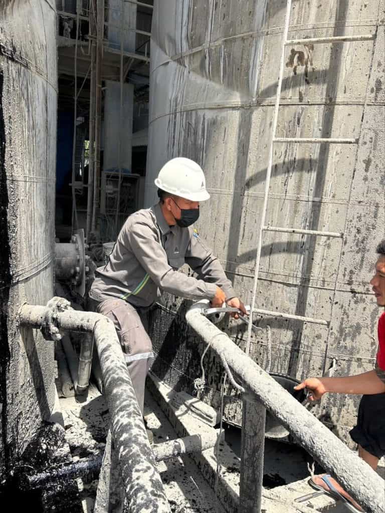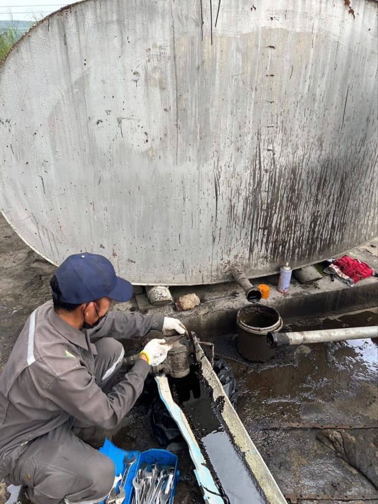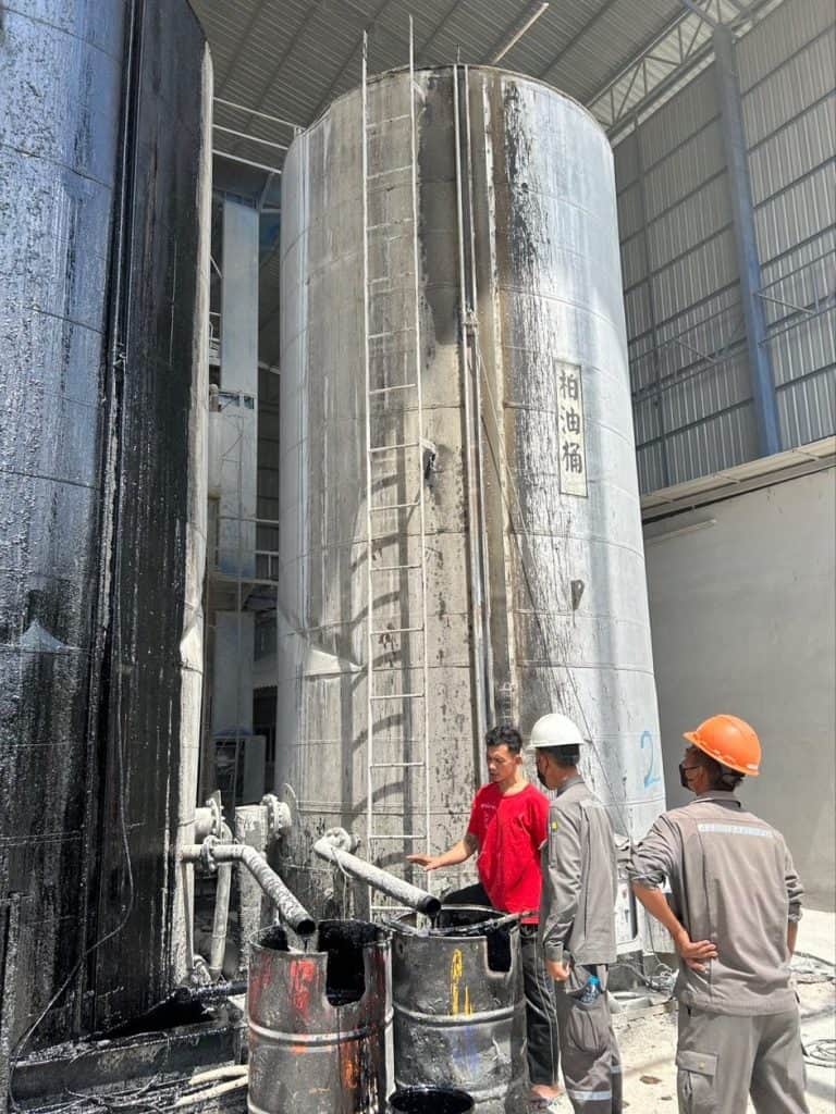 วันที่ 7 กุมภาพันธ์ 2566 จากปัญหาที่พบในขณะสูบถ่ายยางมะตอยเข้าถังเก็บ ที่ห้างหุ้นส่วนจำกัดแซนซันการโยธา จังหวัดนครศรีธรรมราช ฝ่ายขาย และหน่วยงานวิศวกรรม ได้ร่วมกันเข้าไปช่วยตรวจสอบ พบว่ามีตะกรันเกาะติดภายในผนังท่อเป็นจำนวนมาก ทำให้เกิดแรงดันในท่อขณะสูบถ่ายยางมะตอยสูงมากผิดปกติ สาเหตุเกิดจากท่อรับยางมะตอยเข้าถังเก็บถูกติดตั้งอยู่ข้างผนังถังเก็บและมีการหุ้มฉนวนกันความร้อนไว้รอบถังเก็บ ในกรณีที่ไม่มีการรับยางมะตอยเข้าถังเก็บท่อก็จะได้รับความร้อนอยู่ตลอดเวลา ทีมงานของโรงงานสุราษฎร์ธานี แนะนำให้เดินท่อรับยางมะตอยใหม่ ให้อยู่นอกฉนวนกันความร้อนเพื่อป้องกันการไหม้ของยางมะตอยภายในท่อและกลายเป็นตะกรัน เพื่อให้ลูกค้าและผู้สูบถ่ายสินค้าดำเนินงานได้อย่างปลอดภัย