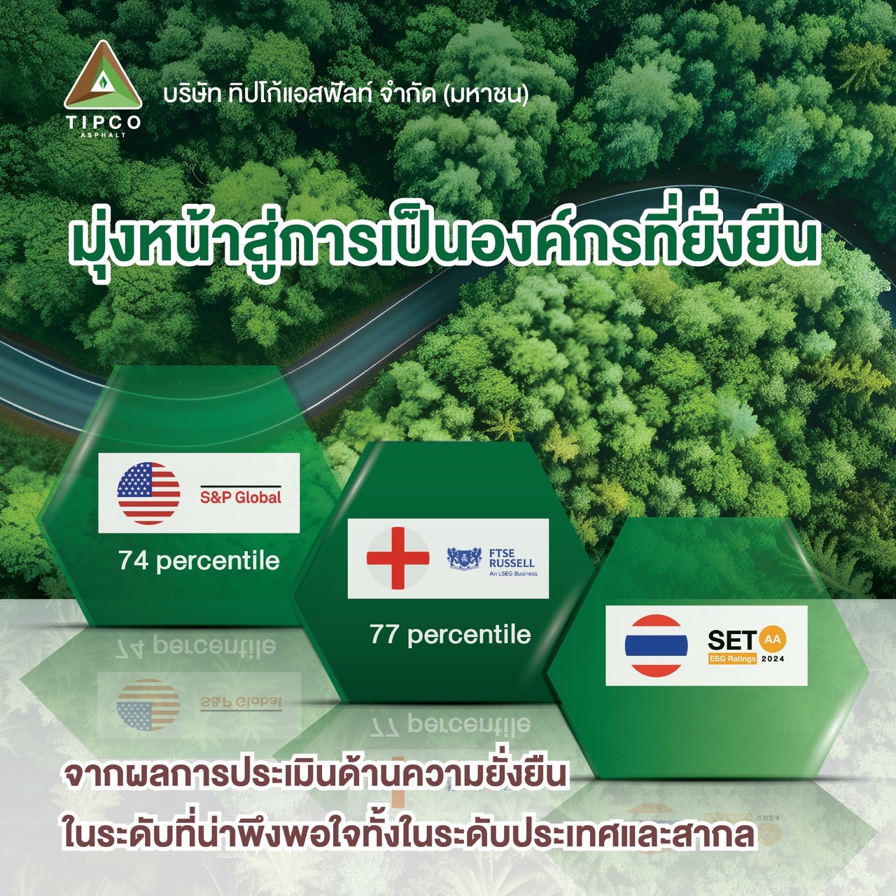 Tipco Asphalt Public Company Limited is committed to developing the organization towards sustainability through economic, social, and environmental. In 2024, the Company’s sustainability assessment results by local and international rating agencies are impressive.
