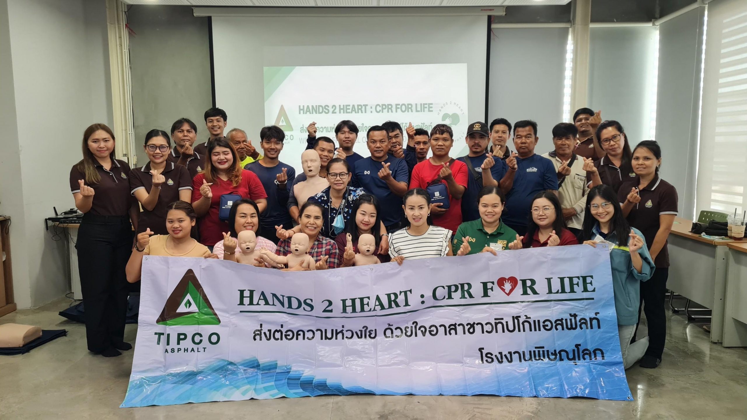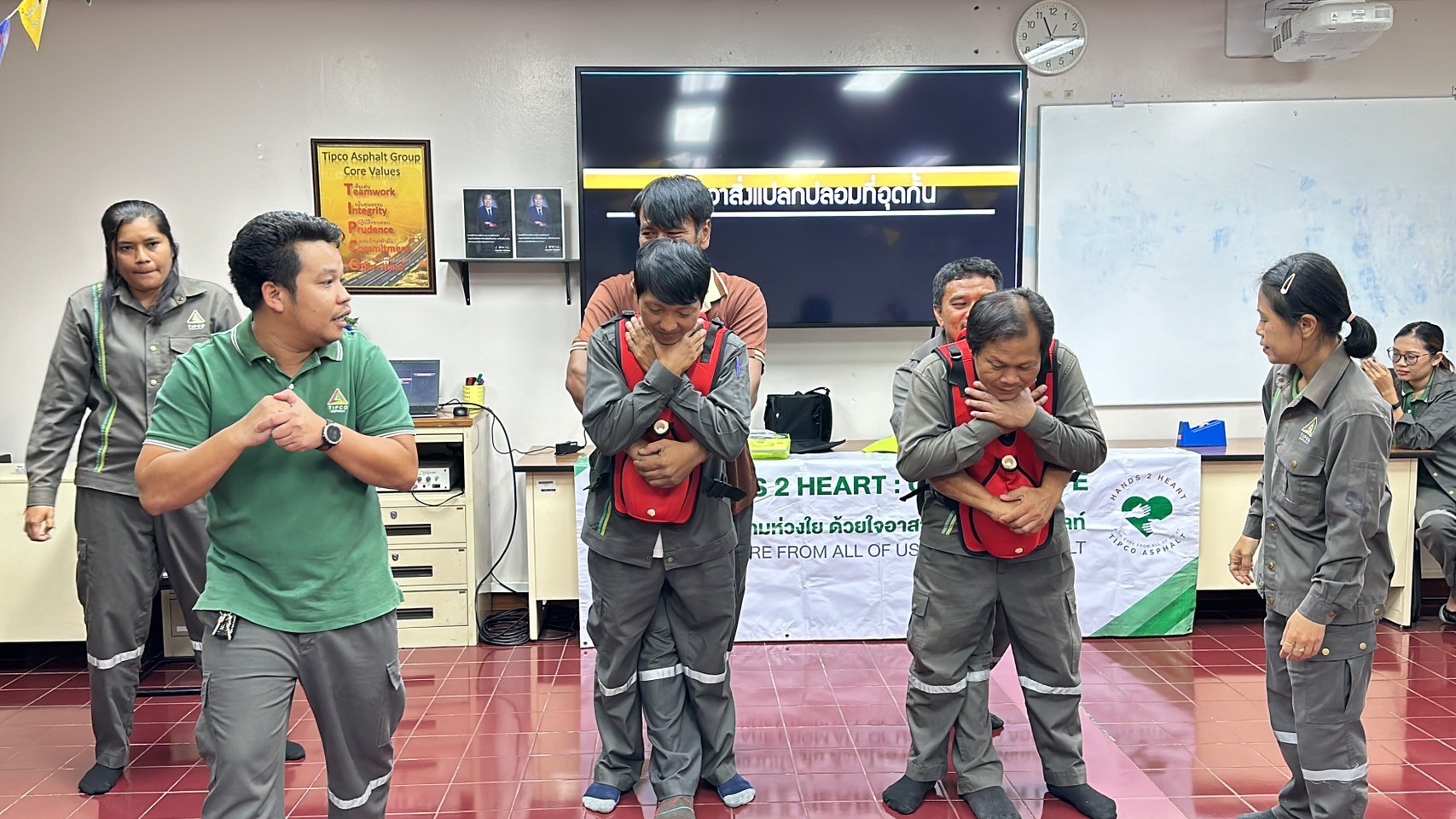 กลุ่มบริษัทฯ ยังให้ความสำคัญกับการเพิ่มความรู้พื้นฐานในด้านความปลอดภัยด้วยการจัดอบรมการกู้ชีพผ่านโครงการ”Hand 2 Heart: CPR FOR LIFE” ส่งต่อความห่วงใยด้วยใจอาสาชาวทิปโก้แอสฟัลท์ โดยในปี 2567 ฝ่ายโรงงานพิษณุโลก ได้จัดกิจกรรมอบรมการช่วยชีวิตขั้นพื้นฐาน (CPR) และการนำสิ่งแปลกปลอมที่อุดกั้นทางเดินหายใจออก ให้แก่ พนักงานบริษัทจำนวน 54 คน ซึ่งเป็นหนึ่งในพันธมิตรของบริษัทฯ โดยมีวัตถุประสงค์เพื่อรณรงค์และประชาสัมพันธ์การช่วยชีวิตขั้นพื้นฐานและวิธีการช่วยชีวิตขั้นพื้นฐานอย่างถูกต้อง เพื่อเพิ่มโอกาสการช่วยเหลือผู้ที่อยู่ในครอบครัวของตนเองหรือผู้อื่นที่ประสบสภาวะหัวใจหยุดเต้นฉับพลัน
