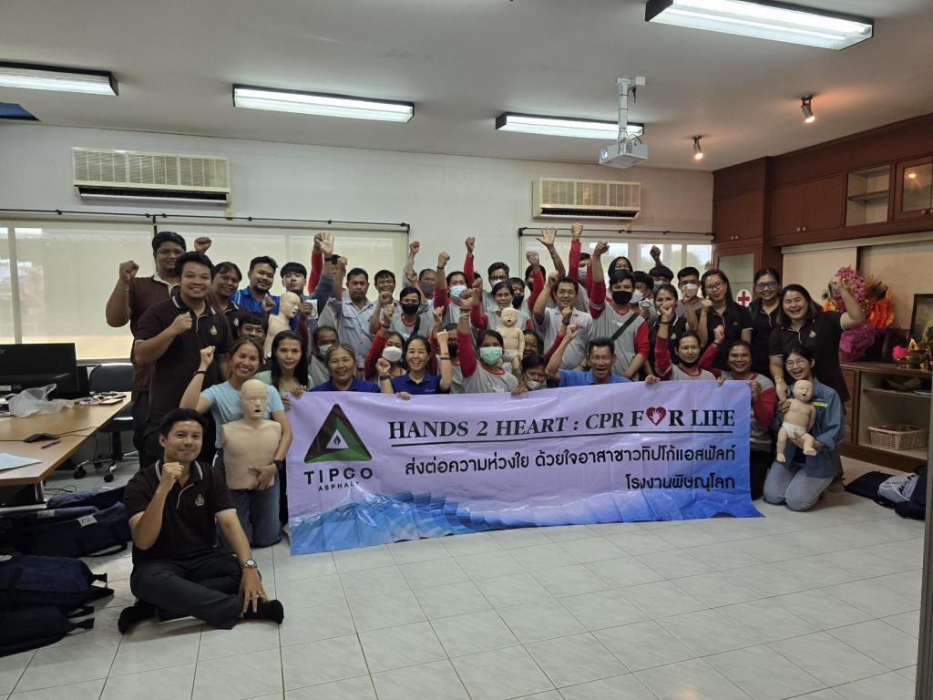 กลุ่มบริษัทฯ ยังให้ความสำคัญกับการเพิ่มความรู้พื้นฐานในด้านความปลอดภัยด้วยการจัดอบรมการกู้ชีพผ่านโครงการ”Hand 2 Heart: CPR FOR LIFE” ส่งต่อความห่วงใยด้วยใจอาสาชาวทิปโก้แอสฟัลท์ โดยในปี 2567 ฝ่ายโรงงานพิษณุโลก ได้จัดกิจกรรมอบรมการช่วยชีวิตขั้นพื้นฐาน (CPR) และการนำสิ่งแปลกปลอมที่อุดกั้นทางเดินหายใจออก ให้แก่ พนักงานบริษัทจำนวน 54 คน ซึ่งเป็นหนึ่งในพันธมิตรของบริษัทฯ โดยมีวัตถุประสงค์เพื่อรณรงค์และประชาสัมพันธ์การช่วยชีวิตขั้นพื้นฐานและวิธีการช่วยชีวิตขั้นพื้นฐานอย่างถูกต้อง เพื่อเพิ่มโอกาสการช่วยเหลือผู้ที่อยู่ในครอบครัวของตนเองหรือผู้อื่นที่ประสบสภาวะหัวใจหยุดเต้นฉับพลัน