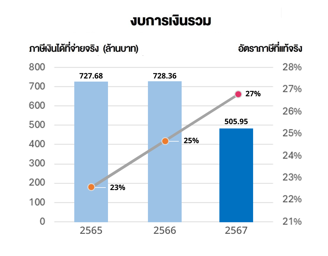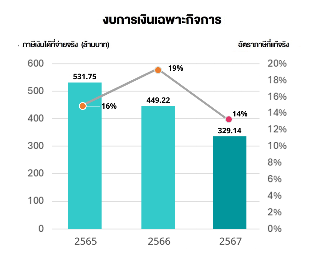 อัตราภาษีเงินได้นิติบุคคลของกลุ่มบริษัทฯ อยู่ในช่วงระหว่าง 17% – 25% โดยอัตราภาษีเงินได้นิติบุคคลของประเทศไทยอยู่ที่ 20% ซึ่งในปี 2567 กลุ่มบริษัทมีอัตราภาษีเงินได้นิติบุคคลที่ 27% ตามงบการเงินรวม และ 14% ตามงบการเงินเฉพาะกิจการ